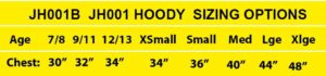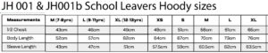 Hoody sizes: we have found that the Year 6 Leavers  very often choose the adults sizes, the smallest being Xtra Small which is rated at a 34″ chest- and the 12/13 childs hoody- is also rated at 34″ chest BUT the Xtra Small has more room generally- the arms are a bit roomier, the length slightly longer